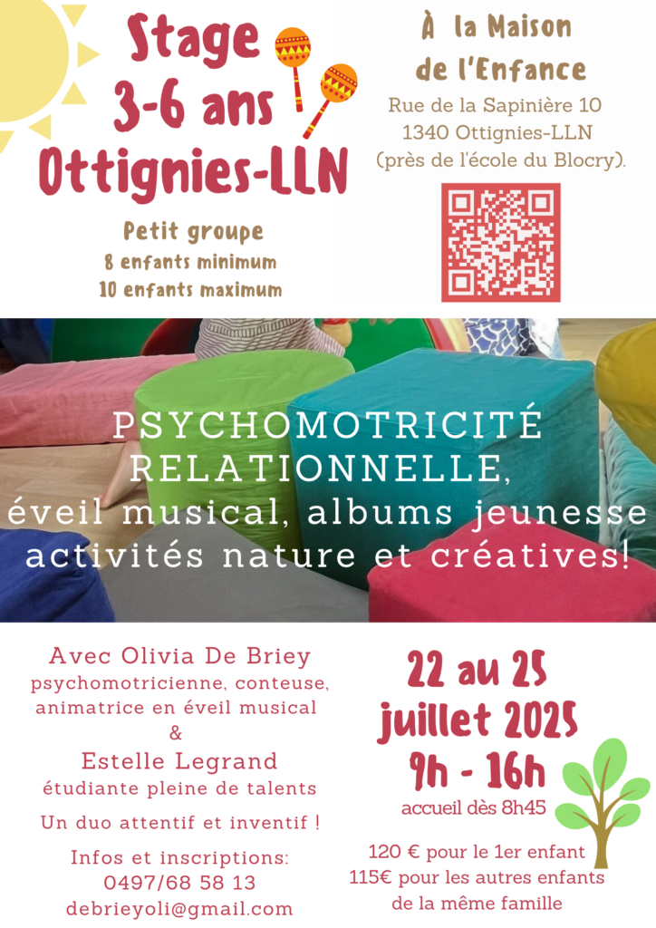 Les Stages Bien Être à Soi, aux Autres et au Monde Découvrez nos stages polyvalents avec toutes les facettes rassemblées de mes activités :Psychomotricité,histoires, éveil musical,activités manuelles,explorations & jeux au verger.Des moments magiques pour grandir, s’amuser,créer et s’émerveiller.Le tout encadré parun.e étudiant.e et moi-même. Calendrier des stages à venir Mini-stage à la Maison de l'Enfance Maison de l'Enfance à Ottignies-Louvain-La-Neuve Du 7 au 11 juillet 2025 de 9h à 12h (accueil à partir de 8h45) Pensé pour les 2,5 à 5 ans Animé par Olivia et un.e étudiant.e Infos & Inscriptions via Isabelle de Bournonville Tel : +32 473 64 08 23 maisondelenfance@olln.be Stage à la Maison de l'Enfance Maison de l'Enfance à Ottignies-Louvain-La-Neuve Du 22 au 25 juillet 2025 de 9h à 16h (accueil à partir de 8h45) Pensé pour les 3 à 6 ans Animé par Olivia et Estelle Inscriptions via Olivia De BrieyTel : +32 497 68 58 13 Prix : 120€oliconteuse@gmail.com Mini-stages à la Maison de l'Enfance Maison de l'Enfance à Ottignies-Louvain-La-Neuve Du 19 au 23 août 2024 de 9 à 12h (accueil 8h45) Pensé pour les 3 à 5 ans Animé par une psychomotricienne (Olivia) + étudiant(e) Inscriptions via Isabelle de Bournonville Tel : +32 473 64 08 23 maisondelenfance@olln.be Mini-stages à la Maison de l'Enfance Maison de l'Enfance à Ottignies-Louvain-La-Neuve Du 15 au 19 juillet 2024 de 9 à 12h (accueil 8h45) Pensé pour les 3 à 5 ans Animé par une psychomotricienne (Sabine) + étudiant(e) Inscriptions via Isabelle de Bournonville Tel : +32 473 64 08 23 maisondelenfance@olln.be